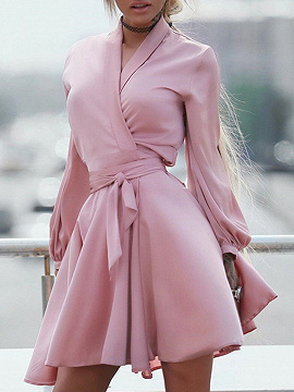 Pink V-neck Tie Waist Long Sleeve Mini Dress